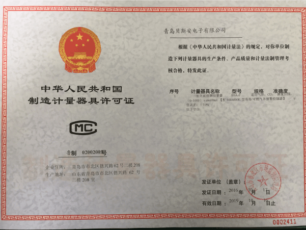 我公司是青島市具有國家質(zhì)量技術(shù)監(jiān)督部門頒發(fā)的計量器具生產(chǎn)許可證的生產(chǎn)企業(yè);獲得國家防爆電氣產(chǎn)品質(zhì)量監(jiān)督檢驗(yàn)中心頒發(fā)的防爆合格證;獲得國家公安部消防產(chǎn)品合格評定中心頒發(fā)的消防產(chǎn)品形式認(rèn)可證書。